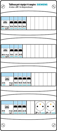 Tableau électrique legrand pré équipé et pré câblé 4 rangées Source google image: https://www.brochain.fr/wp-content/uploads/2017/10/822647_siemens_tableau-electrique-preequipe-4r.jpg